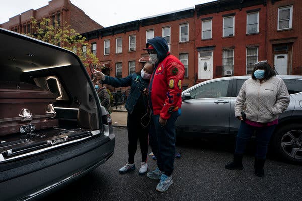 Family members with the coffin of a relative in Brooklyn on Friday.Credit...James Estrin/The New York Times