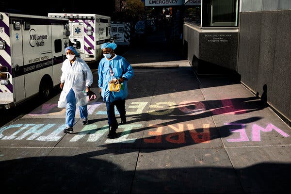 Health care workers walking past NYU Langone Medical Center in Manhattan last week.Credit...Demetrius Freeman for The New York Times