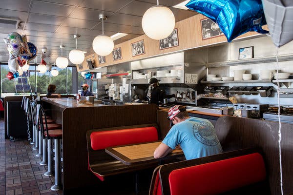 A Waffle House in Madison, Ga., reopened for in-house dining on Monday.Credit...Maranie Staab/Reuters