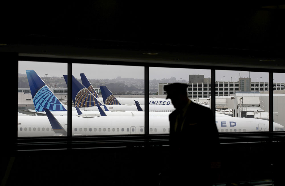 A pilot walks by United Airlines planes as they sit parked at gates at San Francisco International Airport on April 12 in San Francisco. Justin Sullivan/Getty Images