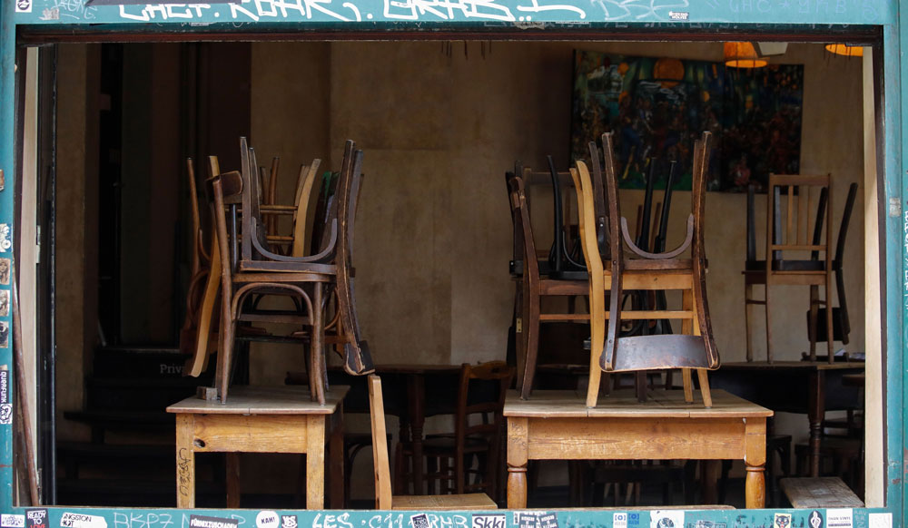 Chairs are stacked on the tables of a cafe in Berlin's Kreuzberg district on April 27, amid the coronavirus pandemic. David Gannon/AFP/Getty Images