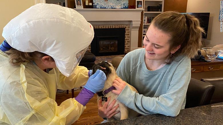 Sydney McClean holds her pug, Winston, while a researcher swabs the dog's mouth for a coronavirus test. Courtesy Heather McClean