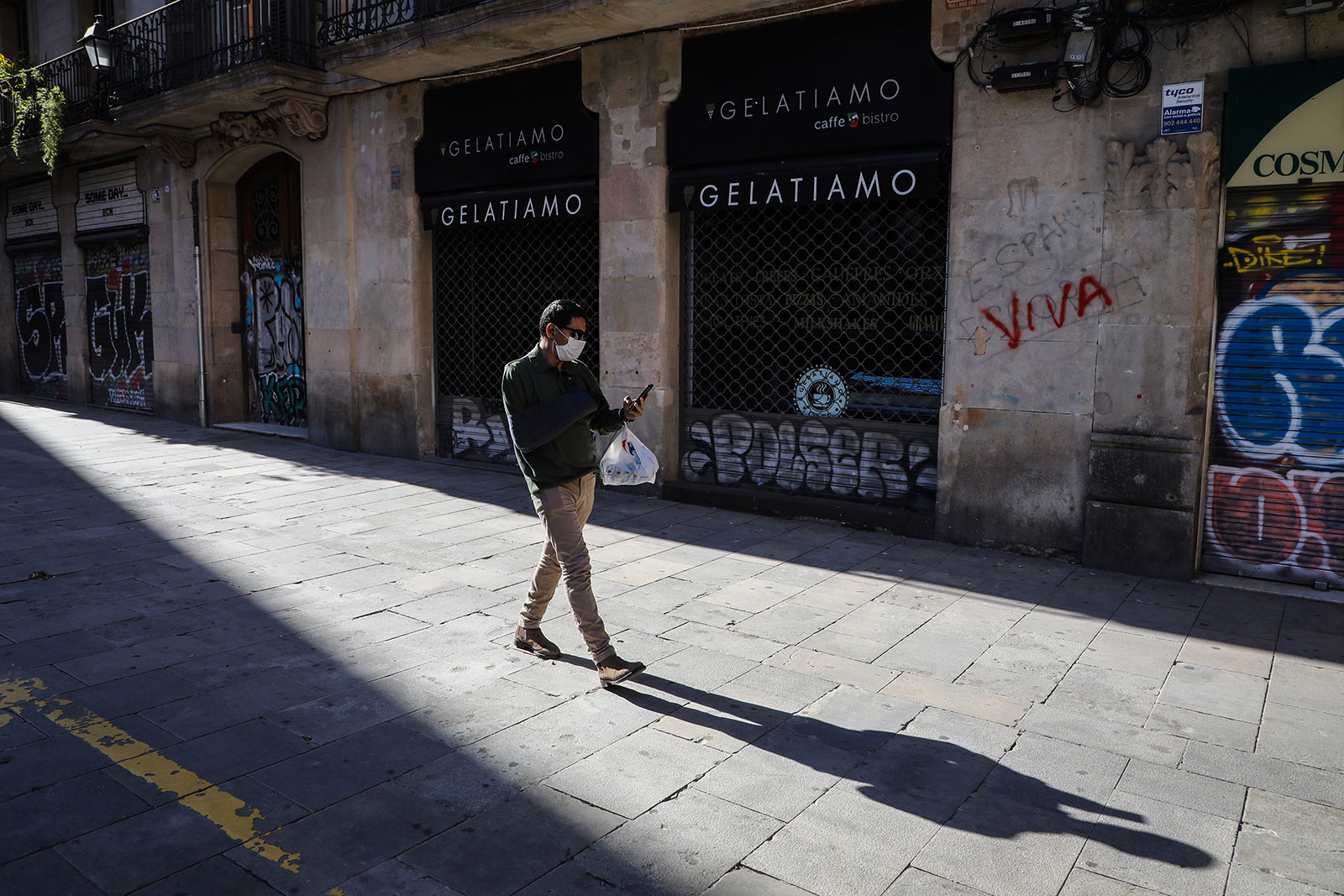 A pedestrian walks past closed stores in Barcelona, Spain, on April 30. Angel Garcia/Bloomberg/Getty Images