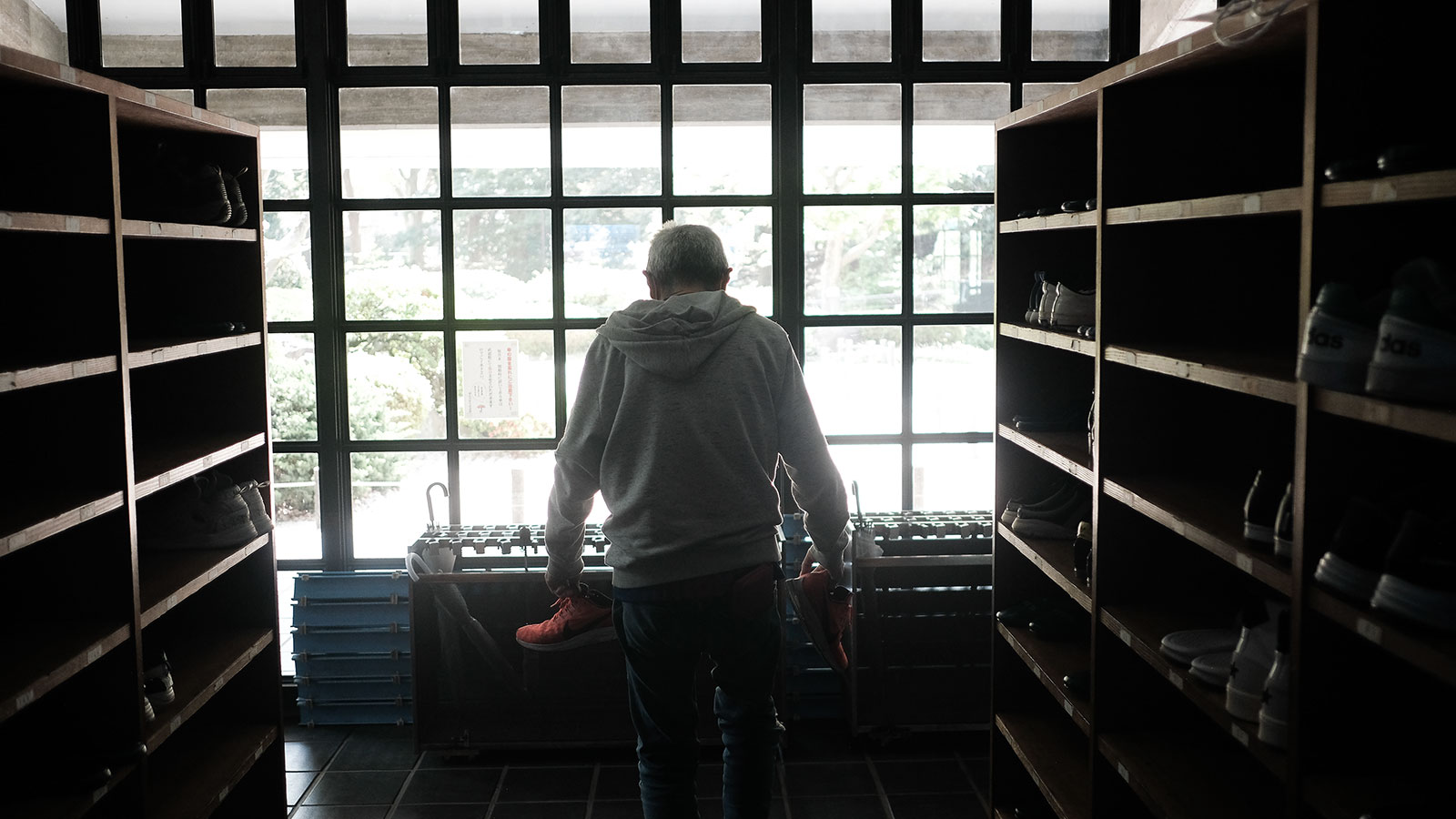 A resident picks up his shoes at a temporally shelter for internet-cafe dwellers at the Kanagawa Budokan martial arts gymnasium in Yokohama, Japan, on April 22. Soichiro Koriyama/Bloomberg/Getty Images