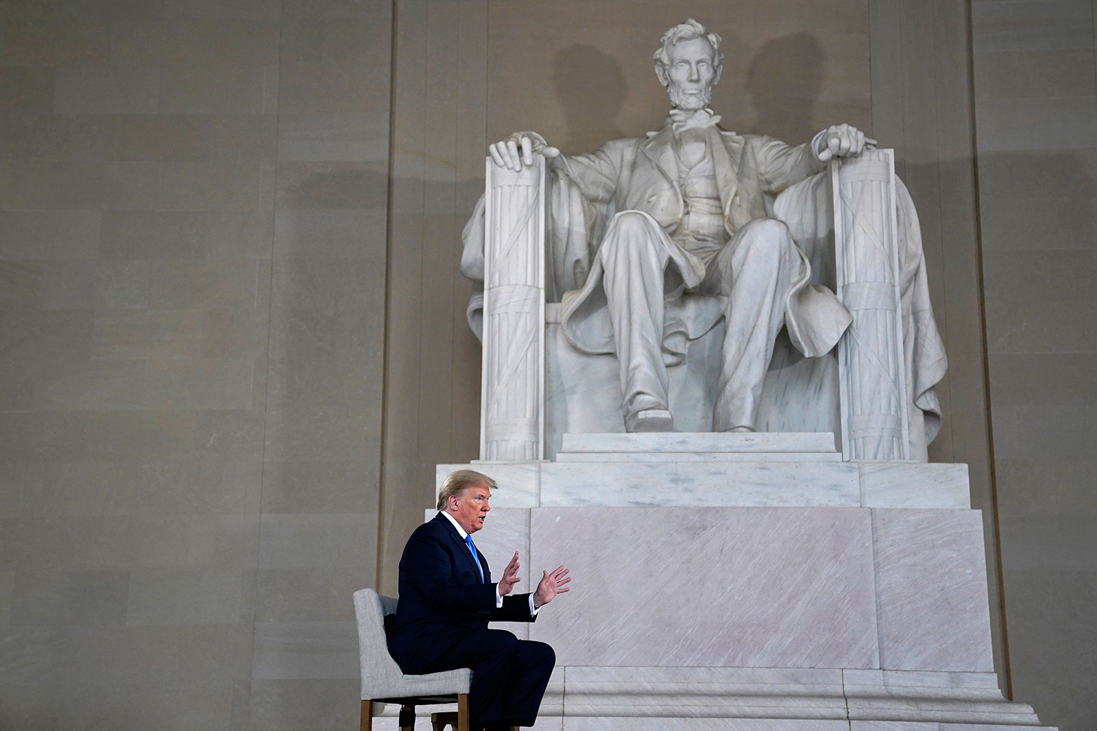 US President Donald Trump speaks during a Fox News virtual town hall from the Lincoln Memorial in Washington on May 3. Evan Vucci/AP