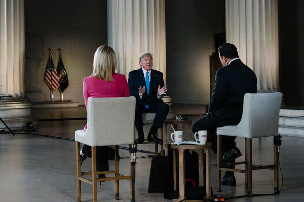 “We’re going to lose anywhere from 75, 80 to 100,000 people,” President Trump said in a virtual “town hall” meeting on Fox News, on Sunday. “That’s a horrible thing. We shouldn’t lose one person over this.”Credit...Anna Moneymaker/The New York Times
