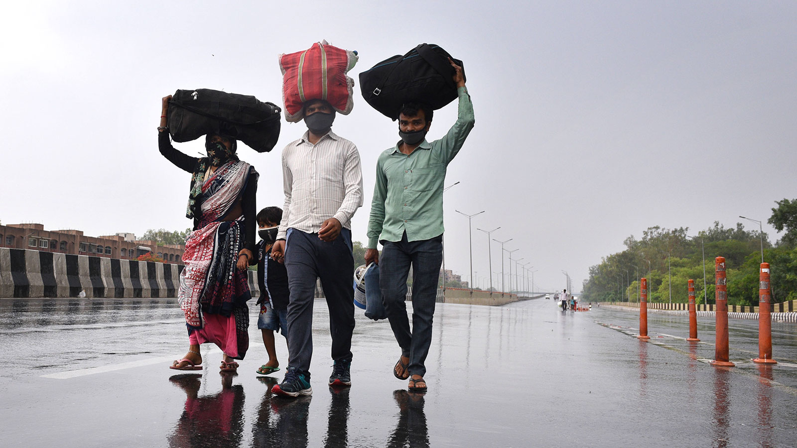 Migrant workers walk towards a bus stop after learning that the administration was preparing to send migrant workers back to their home states during lockdown in New Delhi, India on May 3. Ajay Aggarwal/Hindustan Times/Getty Images