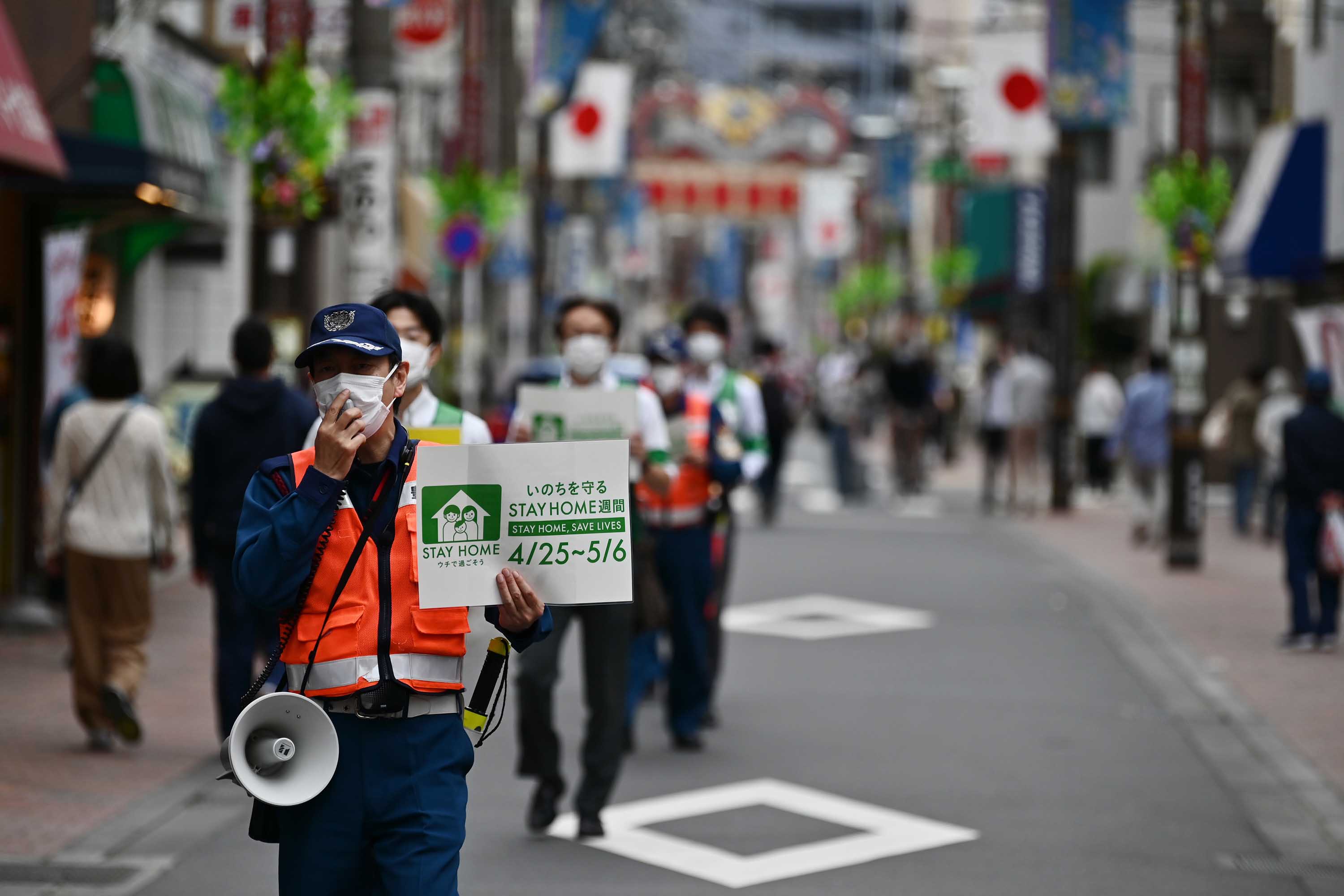 Municipal employees patrol a street asking people to stay home amid the coronavirus outbreak in Tokyo on May 4. Charly Triballeau/AFP/Getty Images