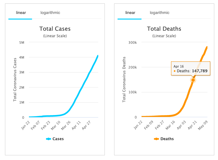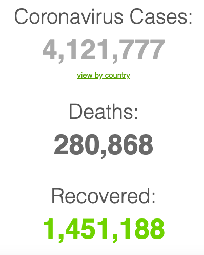 Global coronavirus cases stand at 4,024,973, according to the Johns Hopkins tracker, with global deaths at 279,321. The US has the most fatalities, at 78,794, followed by the UK (31,662) and Italy (30,395).