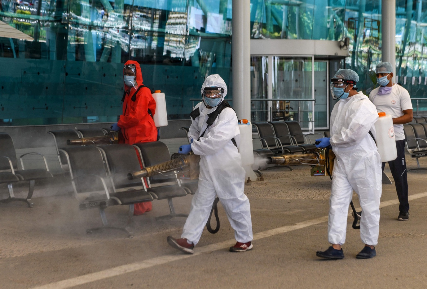 Volunteers spray disinfectant at Sri Guru Ram Dass Jee International Airport in Amritsar, India, on May 15. Narinder Nanu/AFP via Getty Images