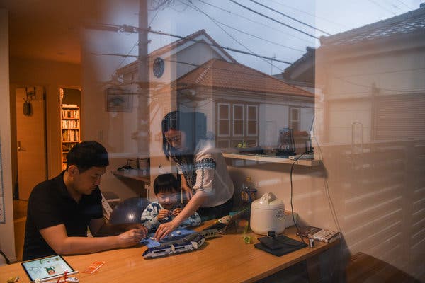 Hiromasa Tsuzaki, his wife, Yuriko, and their son, Rentaro, in their home in Tokyo.Credit...Noriko Hayashi for The New York Times
