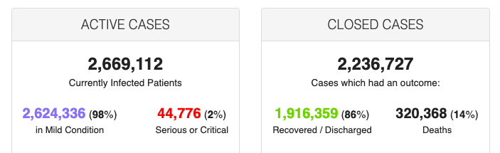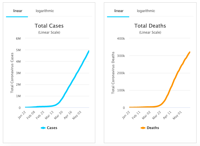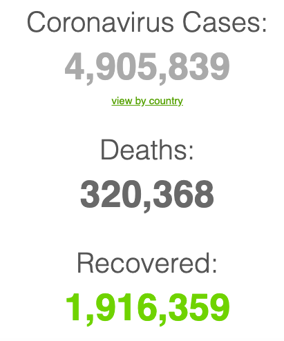 Global cases pass 4.8 million. There are 4,805,005 confirmed coronavirus cases worldwide, according to Johns Hopkins University data. The death toll stands at 318,534. US deaths, the highest worldwide, passed 90,000, and the number of cases climbed above 1.5m, according to the Johns Hopkins University tracker.