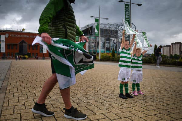 Celtic F.C. fans celebrated outside Celtic Park in Glasgow after the team was declared the champion of the Premiership. The season was cut short with eight games remaining.Credit...Jeff J Mitchell/Getty Images