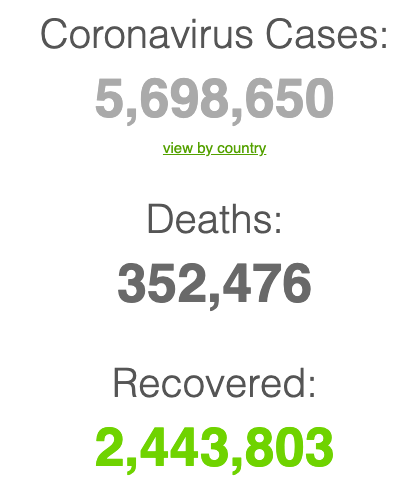 Known global deaths pass 350,000. More than 350,000 people have now lost their lives in the coronavirus pandemic worldwide, according to the Johns Hopkins University tracker. The current toll stands at 350,456. The number of confirmed cases is 5,589,932, after the number of declared cases doubled in a month, with more than one million new cases registered in the last 11 days. There were 500,000 cases registered in just 48 hours, between Sunday, when cases passed 5 million, and Tuesday, when cases passed 5.5 million. True death tolls and cases are likely to be significantly higher due to differing definitions and testing rates, delays and suspected underreporting. The US alone accounts for less than a third of the global toll, with 98,916 deaths.