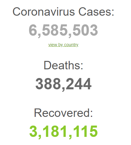 Known coronavirus cases pass 6.4 m. According to Johns Hopkins University, there have been 6,430,705 known coronavirus cases so far, and 385,947 deaths reported.