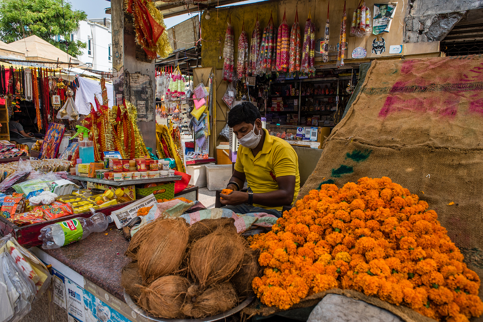 An Indian shopkeeper sells votive threads, coconuts and flower garlands on June 8, in Delhi, India. Yawar Nazir/Getty Images