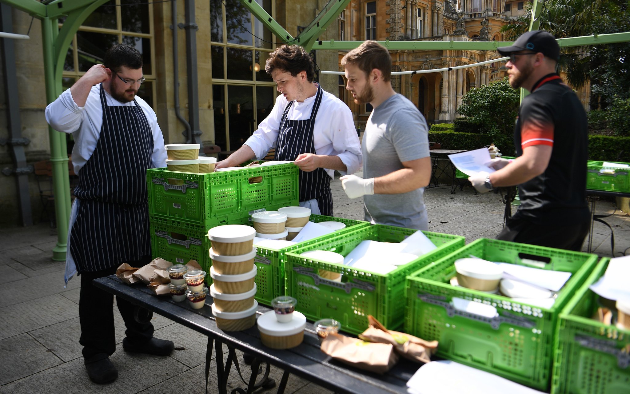 Staff at Waddesdon Manor prepare hot free school lunches for disadvantaged children in Buckinghamshire, Britain, in April. The country will continue to provide food to low-income families over the summer school break.Credit...Andy Rain/EPA, via Shutterstock