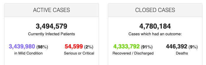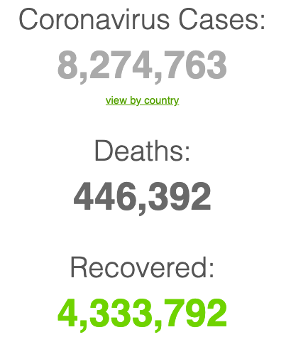 Deaths worldwide are nearing 445,000. According to the Johns Hopkins University tracker, which relies on official government data, the global coronavirus death toll stands at 443,685. There are 8,174,009 known infections.