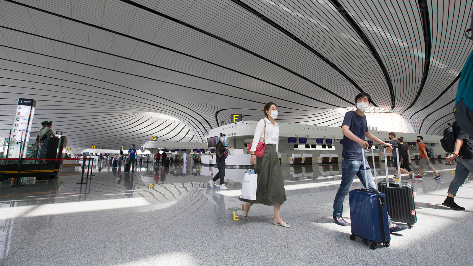People wearing face masks walk at Beijing Daxing International Airport in Beijing. Zhang Yun/China News Service/Getty Images