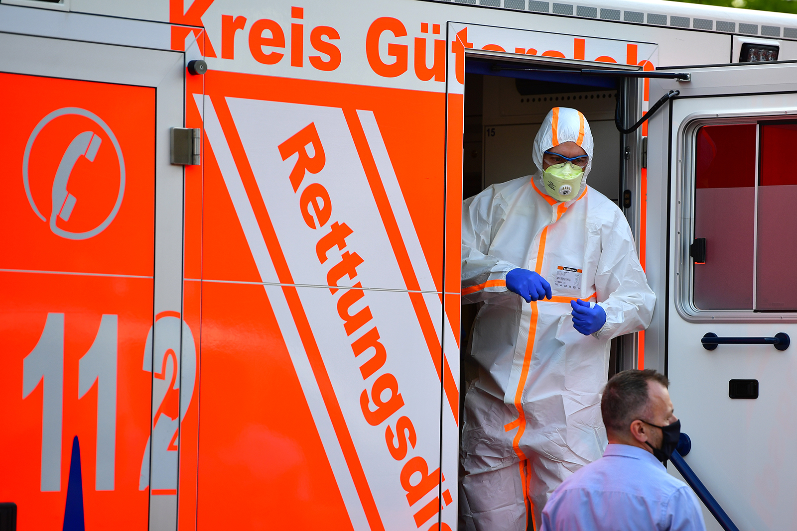 A paramedic wearing full body protection stands inside an ambulance on June 20, in Verl, near Guetersloh, Germany. Alexander Koerner/Getty Images
