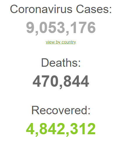 The total number of confirmed coronavirus cases passed 8.9 million. The figure currently stands at 8,929,394, while the global death toll is at 467,676, according to the Johns Hopkins University tracker. Both figures are likely to be higher in reality, due to differing testing rates and definitions, time lags and suspected underreporting.