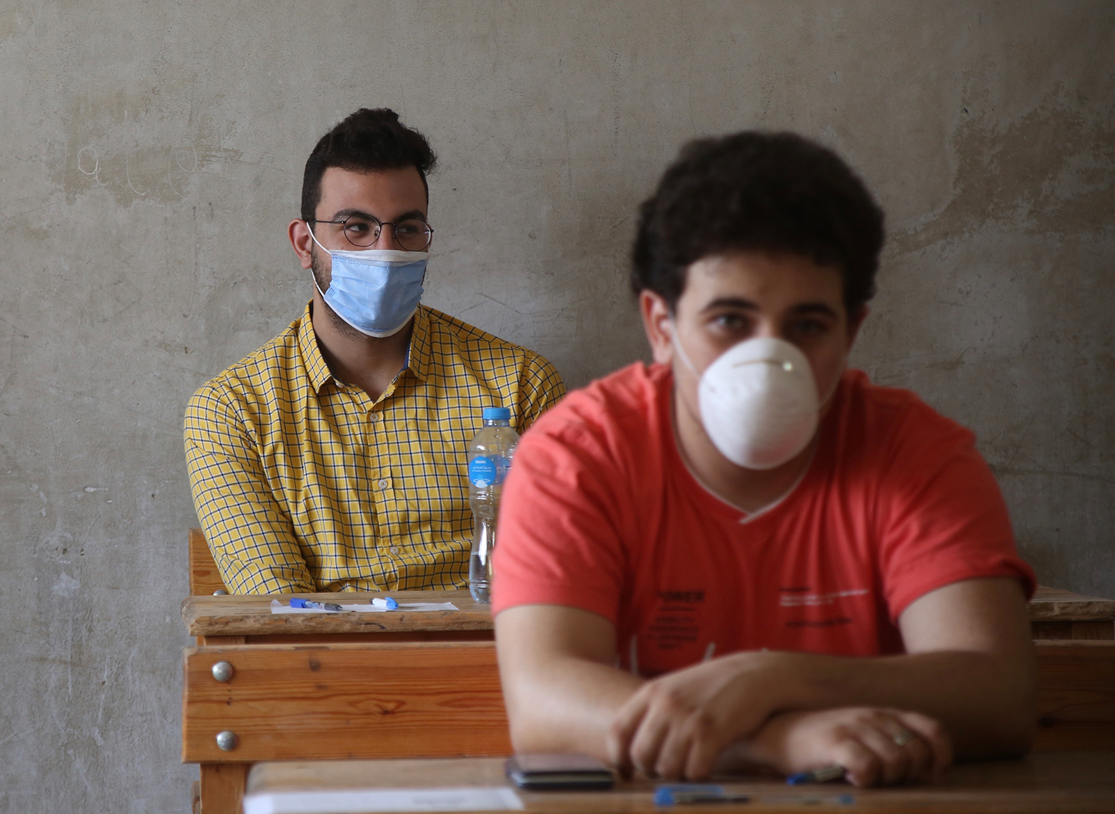 Students wearing face masks are seen at a high school exams site in Cairo, Egypt, on June 21. Alaa Ahmed/Xinhua/Getty Images