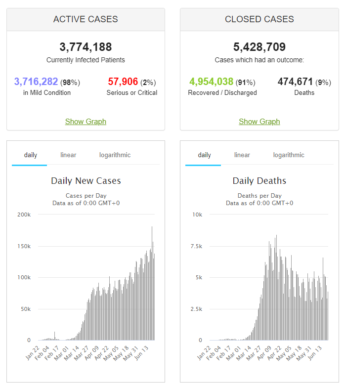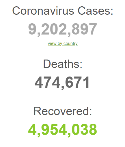 · Confirmed cases of coronavirus passed 9 million. According to Johns Hopkins University, which keeps a tally of official statistics, 9,079,452 cases have been reported. At least 471,754 people have died. The United States is the world’s worst affected country by case numbers, with more than 2.3 million cases and 120,402 deaths.