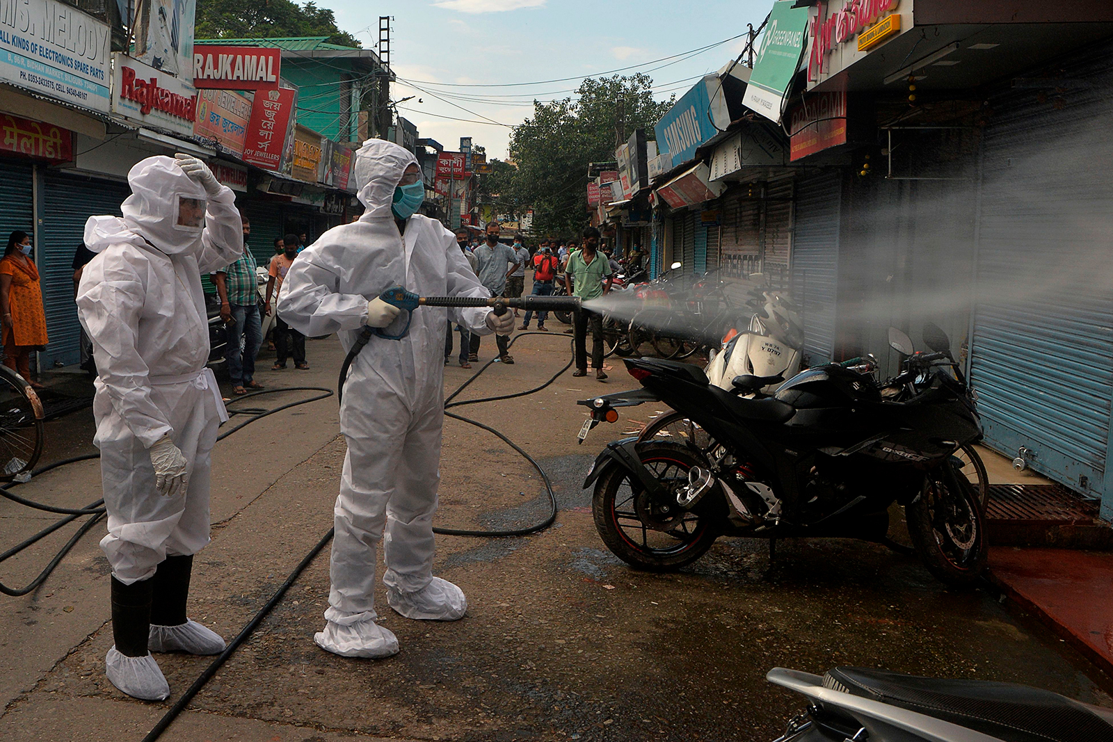 Firefighters wearing personal protective gear spray disinfectant in a closed market in Siliguri, India on June 22. Diptendu Dutta/AFP/Getty Images