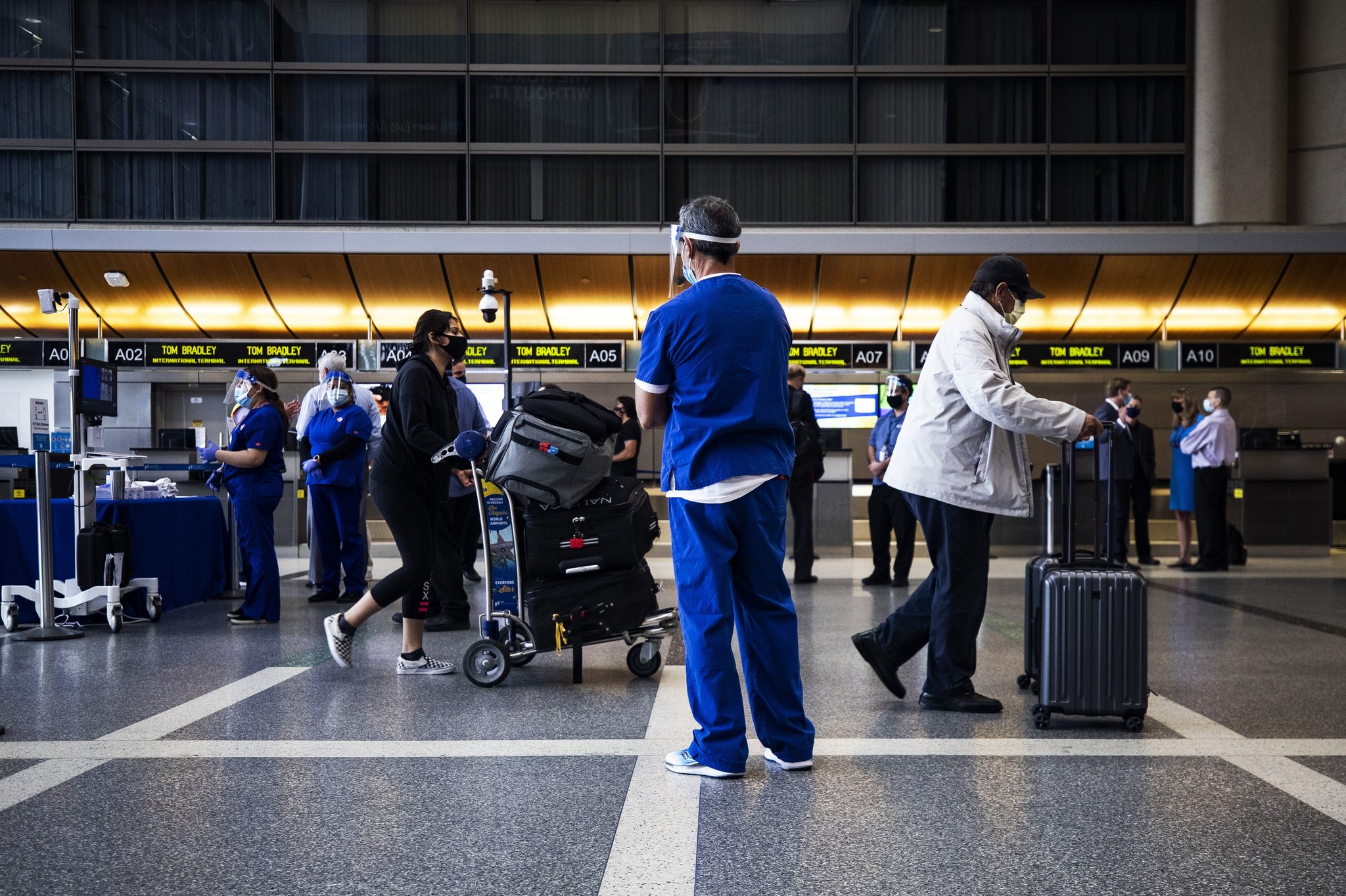 Travelers at Los Angeles International Airport on Tuesday.Credit...Etienne Laurent/EPA, via Shutterstock