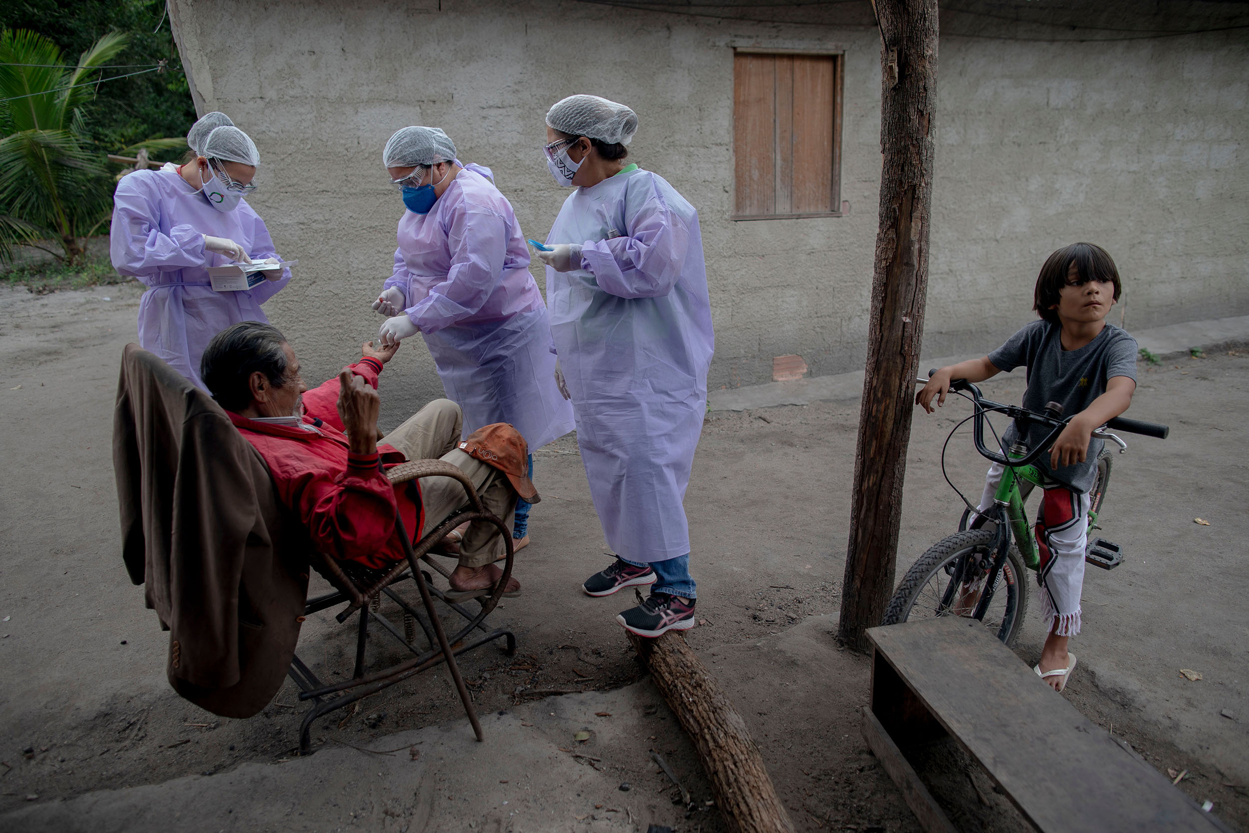 Health professionals administer COVID-19 tests to an elderly indigenous Guarani man in Marica, Brazil, on July 2. Mauro Pimentel/AFP/Getty Images