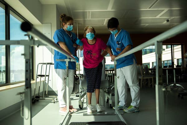 Monique Gretry, 72, during a physical rehabilitation workout in the recovery ward for Covid-19 patients at the MontLegia CHC hospital in Liege, Belgium.Credit...Francisco Seco/Associated Press