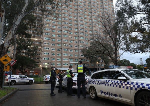 Police officers enforcing a lockdown at public housing towers in Melbourne, Australia, on Saturday.Credit...David Crosling/EPA, via Shutterstock