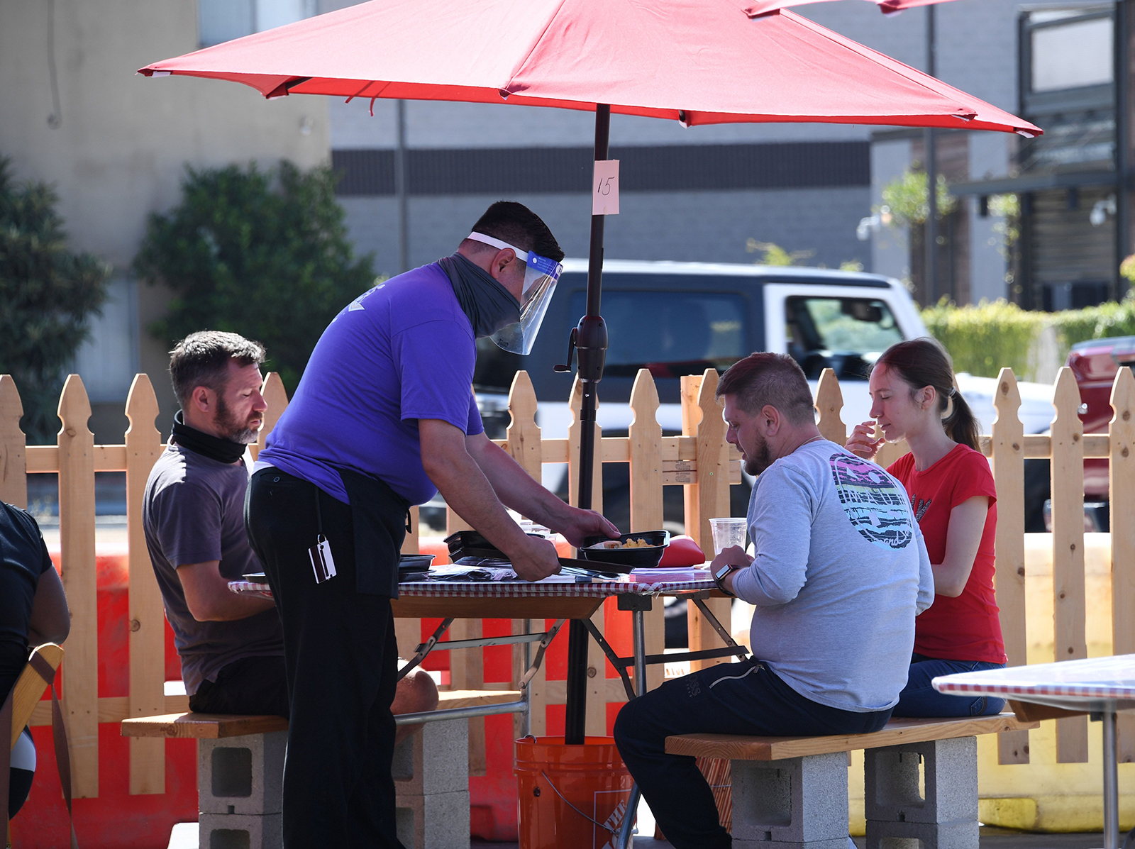 A waiter wearing protective gear serves food to customers on the patio at Pann's restaurant and coffee shop on July 4, in Los Angeles. Robyn Beck/AFP/Getty Images