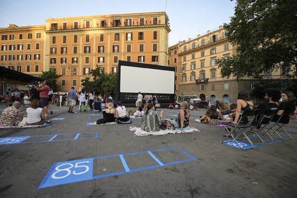 Social-distancing markings at an outdoor movie showing in Rome last week.Credit...Riccardo Antimiani/EPA, via Shutterstock