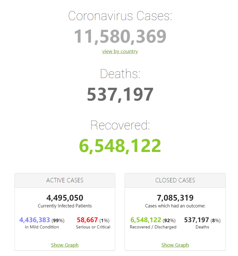 · Global cases near 11.5m. There are 11,419,638 confirmed coronavirus cases worldwide, according to researchers at Johns Hopkins University, as the number of infections continue to rise by around 1m per week. There are 15 countries with more than 200,000 known cases each.
