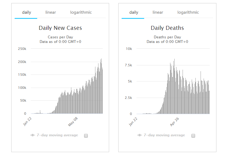 · US cases near 3 million. Known US coronavirus cases stand at almost 3 million, with 2,911,888 currently confirmed on the Johns Hopkins University tracker.The country’s death toll passed 130,000 on Monday, following a massive surge of new cases that has derailed efforts to restart the economy. Nonetheless, the White House claimed on Monday that the US has been “a leader” in the global fight against coronavirus, despite and America recently witnessing the highest ever number of new daily cases reported in the world, with over 55,000.