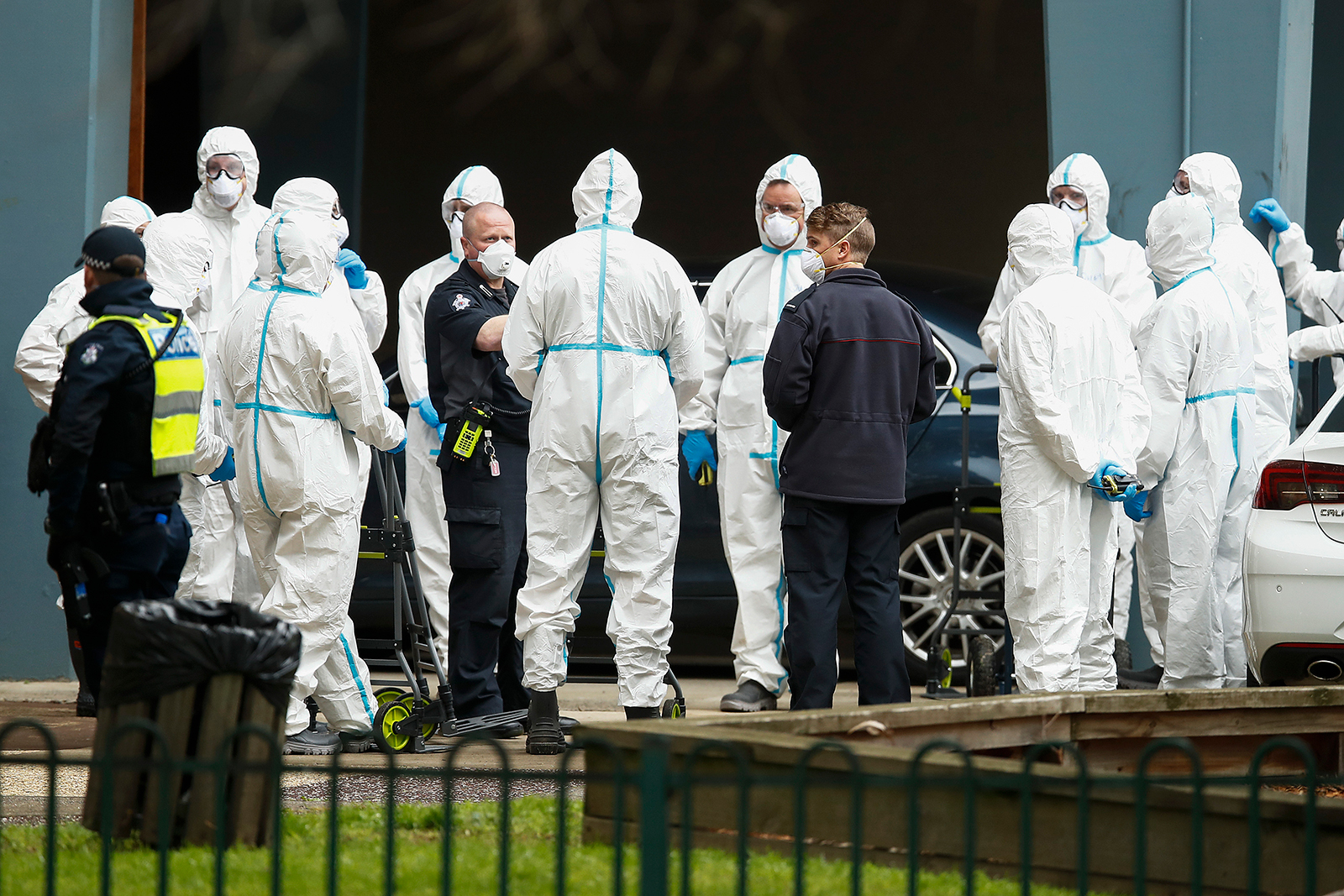 Workers in personal protective equipment are seen, along side police patrols, on July 7, in Melbourne, Australia. Daniel Pockett/Getty Images