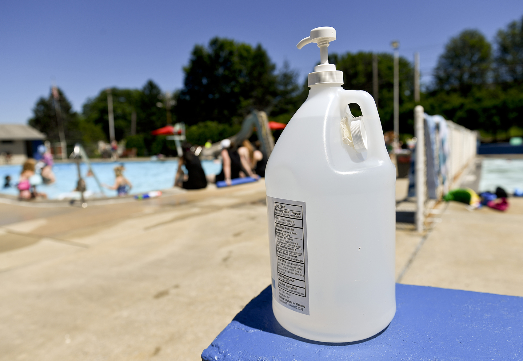 A large bottle of hand sanitizer near a pool in Spring Township, Pennsylvania, on June 13. Ben Hasty/MediaNews Group/Reading Eagle/Getty Images