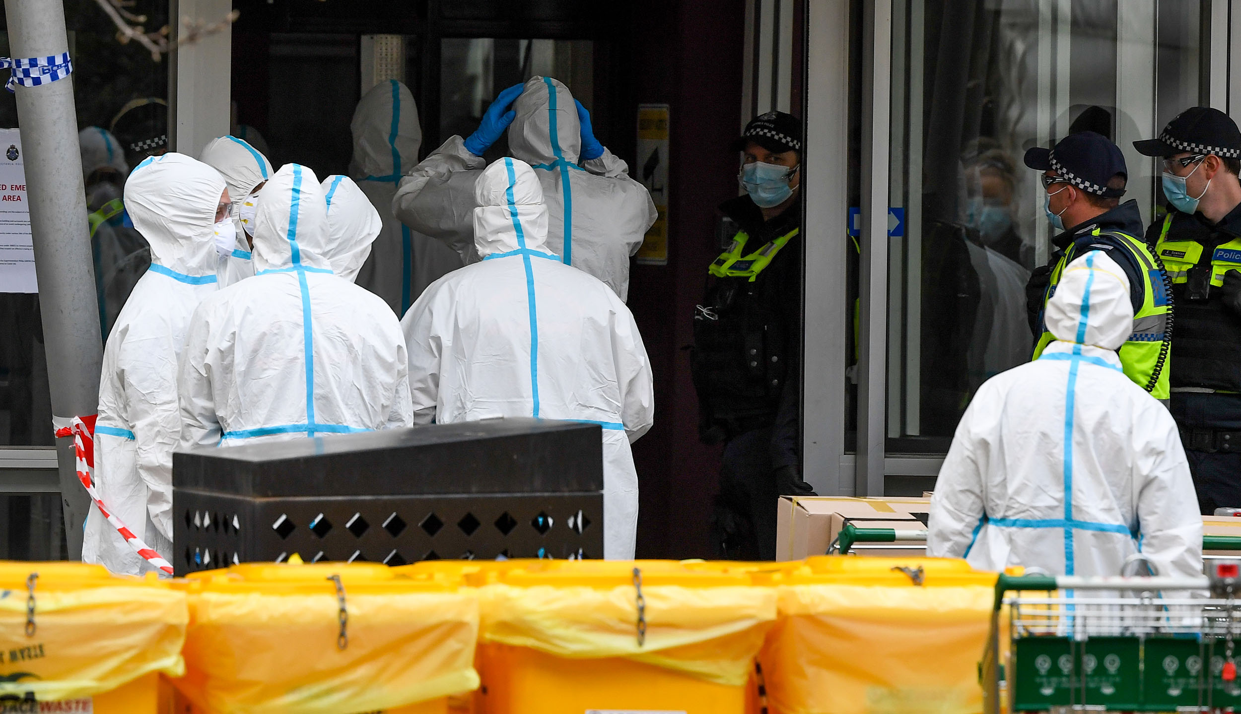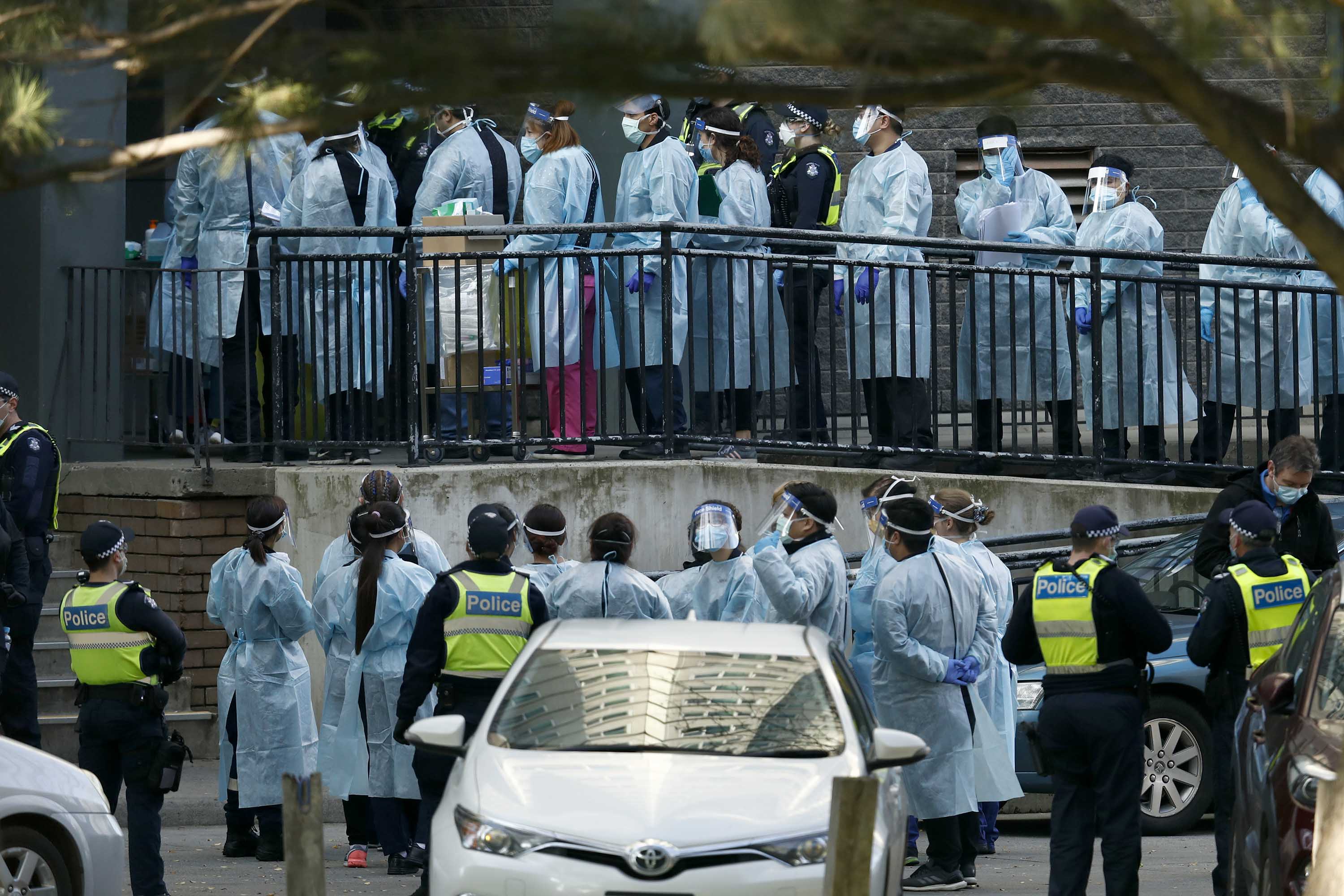Lines of healthcare professionals are seen entering the North Melbourne Public Housing tower complex in Melbourne, Australia, on July 8. Darrian Traynor/Getty Images