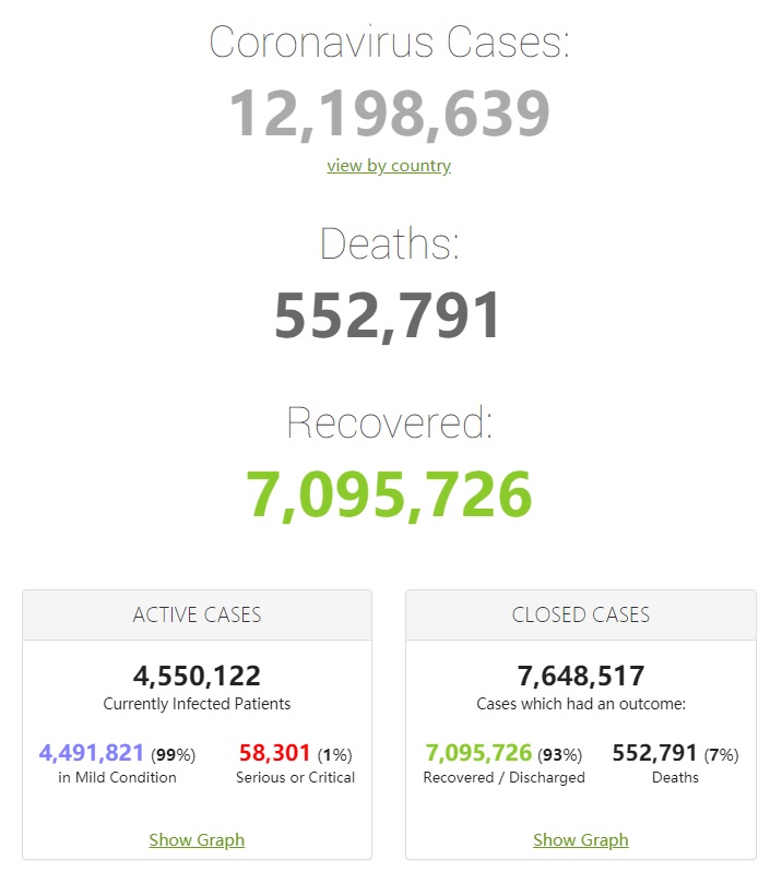 The number of confirmed infections worldwide over the course of the pandemic so gar is nearing 12 million, according the Johns Hopkins University tracker, which relies on official government data, with 11,982,883 currently confirmed.
