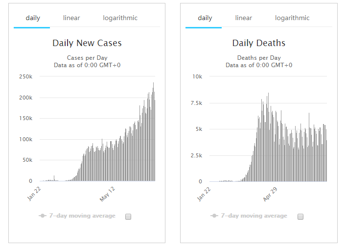 · The World Health Organization reported a record increase in global coronavirus cases on Sunday, with the total rising by 230,370 in 24 hours. The biggest increases were recorded in the United States, Brazil, India and South Africa.