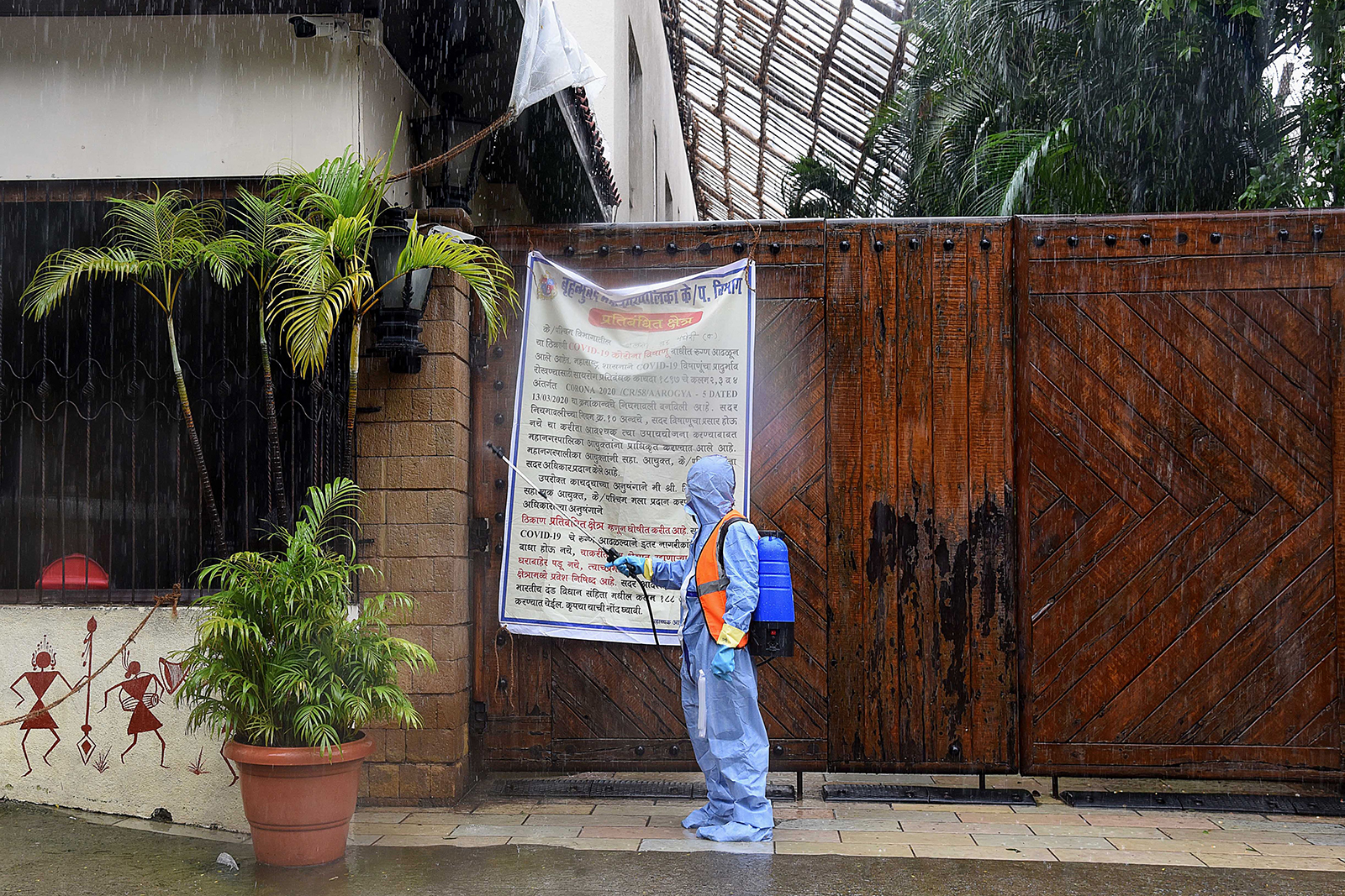 A civic authority worker sprays sanitizer on the main door of the residence of Bollywood star Amitabh Bachchan as he tested positive for COVID-19 in Mumbai on July 12. Sujit Jaiswal/AFP/Getty Images