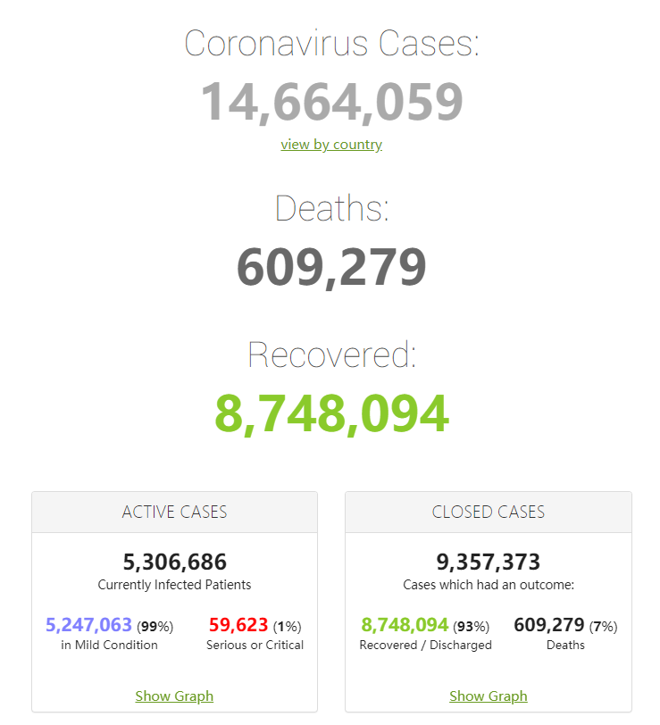 · Nearly 14.5 million people have been tested positive for coronavirus worldwide so far, according to the Johns Hopkins University tracker, which relies on official government data.The current total stands at 14,457,916. The death toll is 605,205.