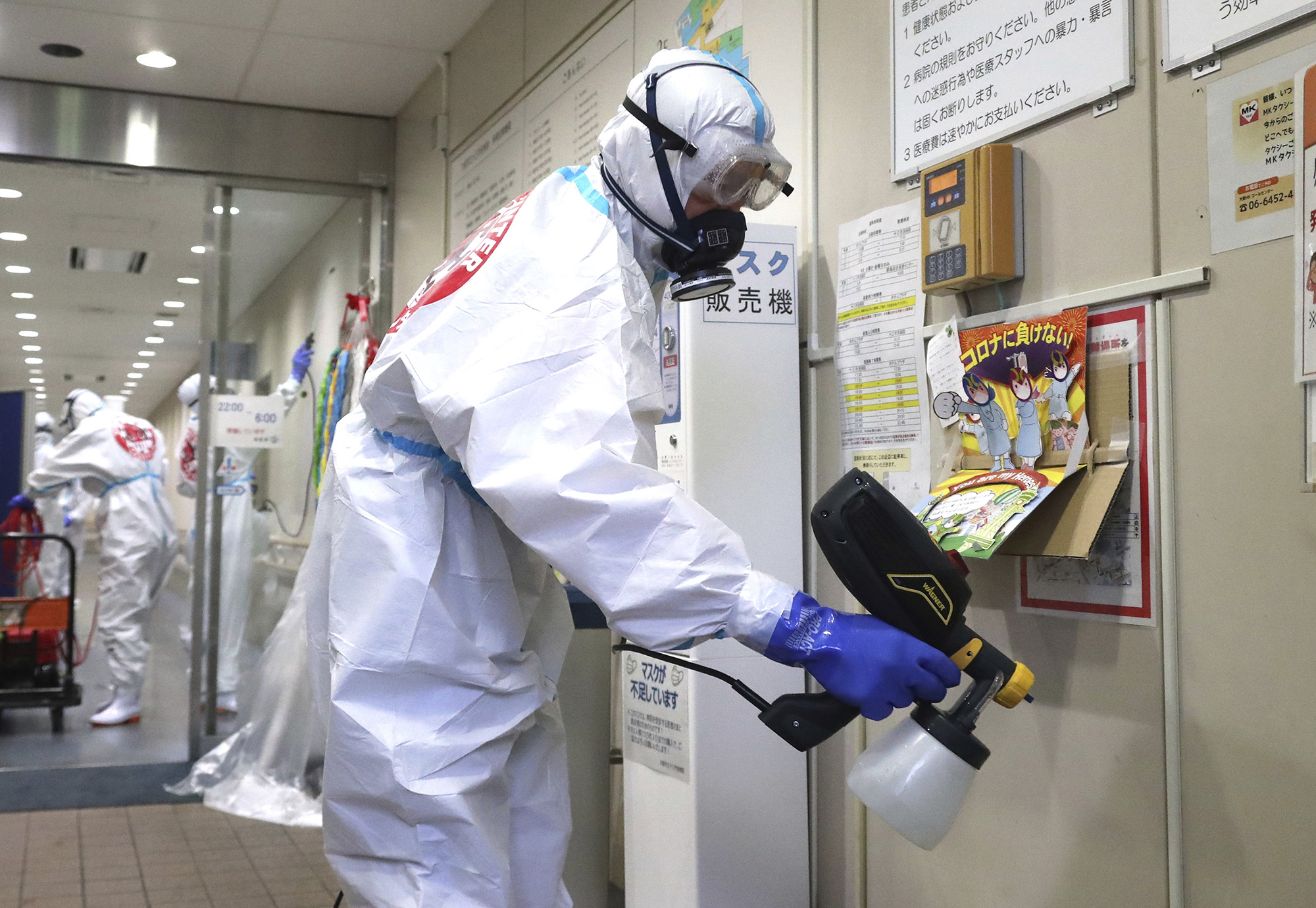 Workers disinfect inside of Osaka City Juso Hospital ahead of reopening of outpatient care in Osaka, Japan, on July 9. The Yomiuri Shimbun/AP