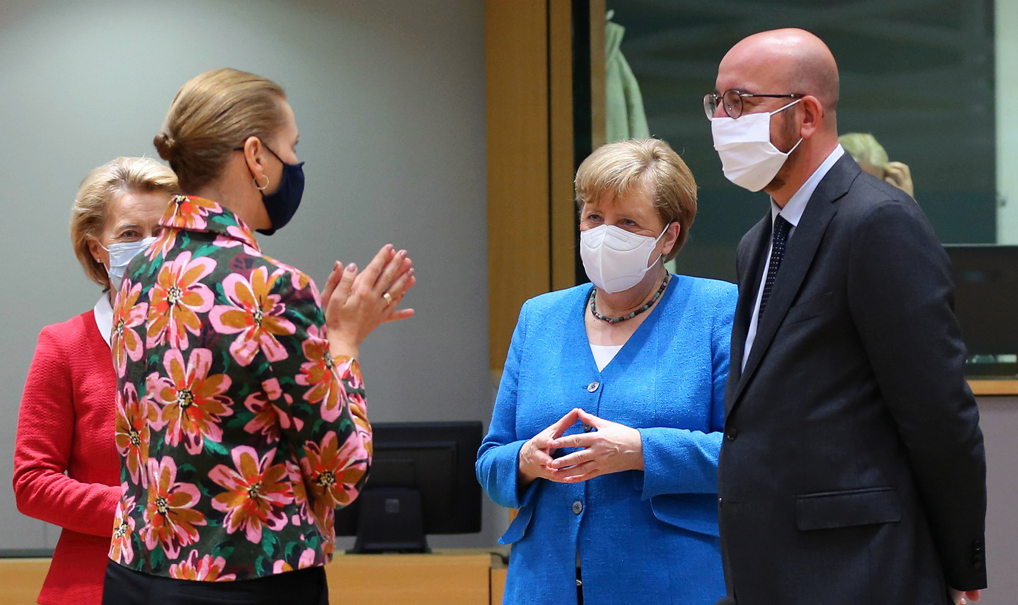 German Chancellor Angela Merkel (2nd R), President of the European Council Charles Michel (R) and Prime Minister of Denmark Mette Frederiksen (L) and Prime Minister of Portugal Antonio Costa (L) attend EU summit to discuss EU's long-term budget and coronavirus recovery plan in Brussels, Belgium on July 18. Dursun Aydemir/Anadolu Agency/Getty Images