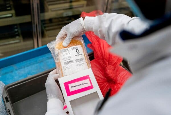 A lab technician with packs of convalescent plasma donated by recovered Covid-19 patients.Credit...Alex Edelman/Agence France-Presse — Getty Images