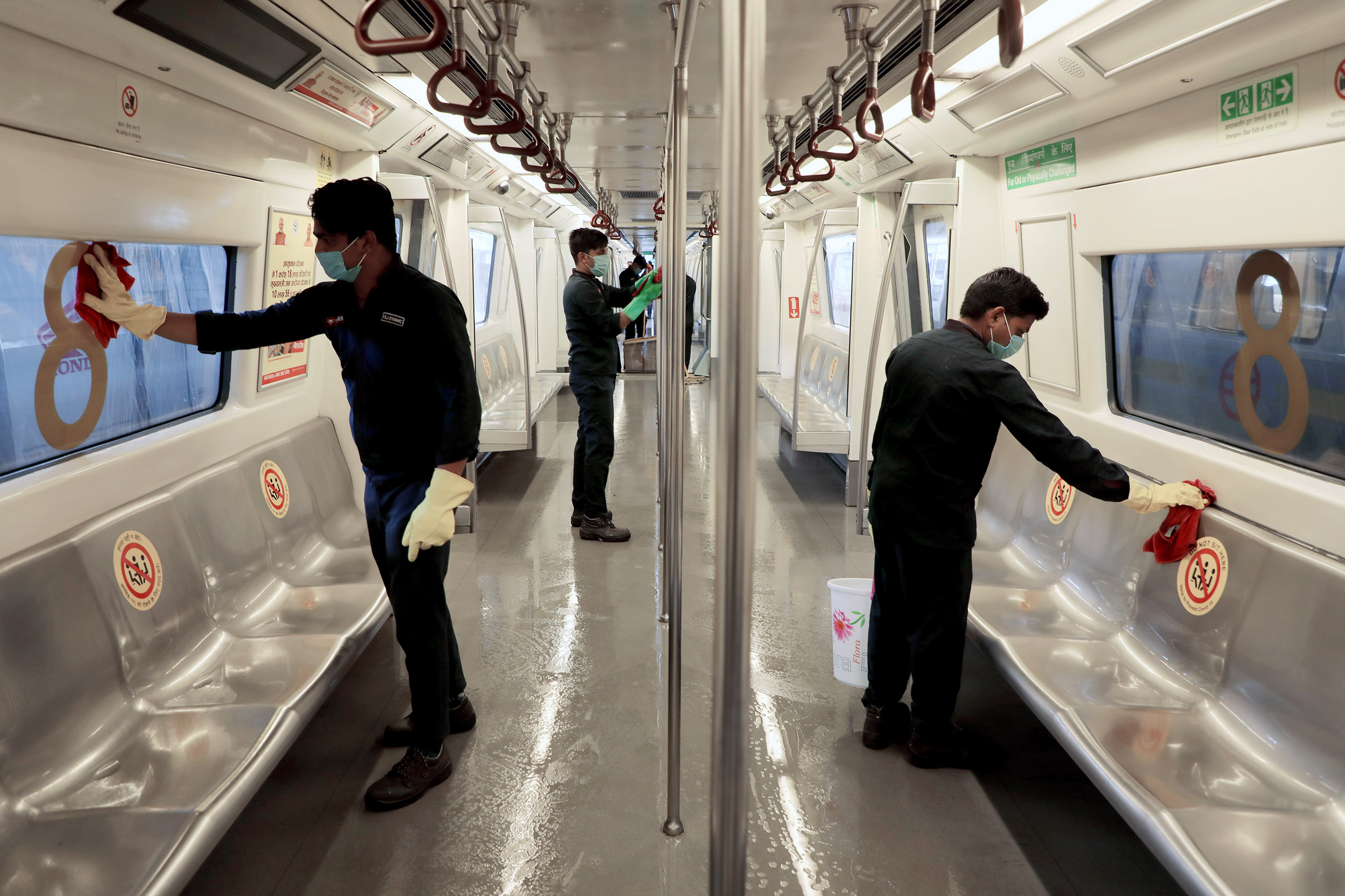 Workers disinfect the interior of a Delhi metro rail carriage at the Khyber Pass metro depot ahead of the resumption of services in New Delhi on Sunday, September 6. T. Narayan/Bloomberg via Getty Images