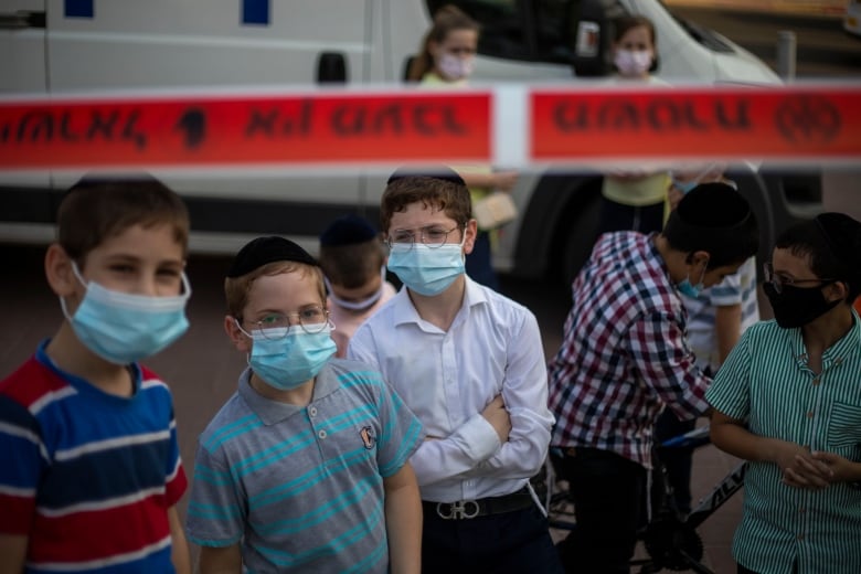Children wear face masks as they gather in Bnei Brak, Israel, on Sunday. New curfews go into effect in some 40 towns and cities on Monday. (Ariel Schalit/The Associated Press)