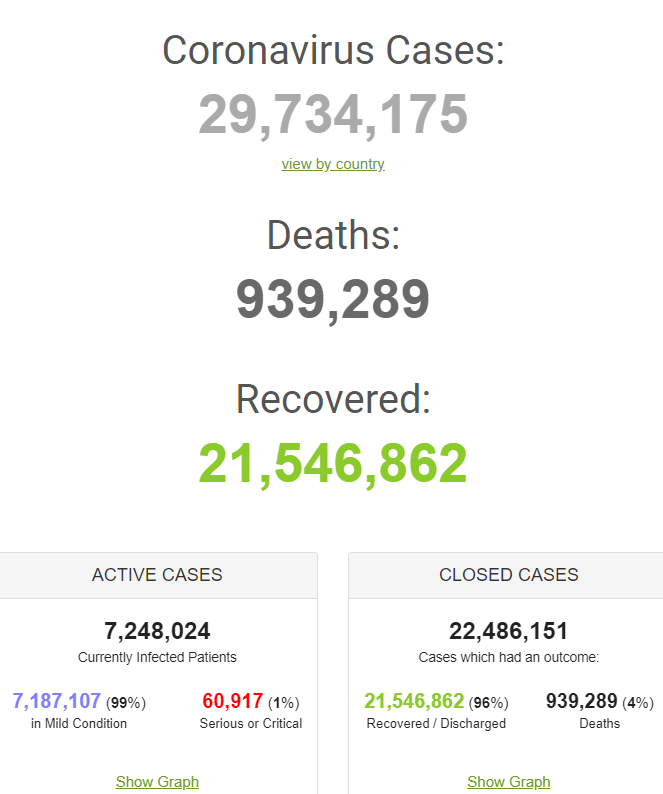 Nearly 29.7 million people around the world have been diagnosed with COVID-19 and 937,543 have died, according to data from Johns Hopkins University. More than 20 million people have recovered from the disease.