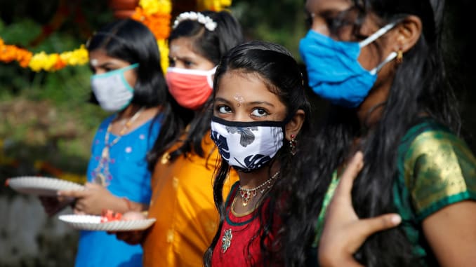 Girls wearing protective face masks wait to pray inside temple premises on the occasion of the annual harvest festival of Onam, amidst the spread of the coronavirus disease (COVID-19), on the outskirts of Kochi, India, August 31, 2020.